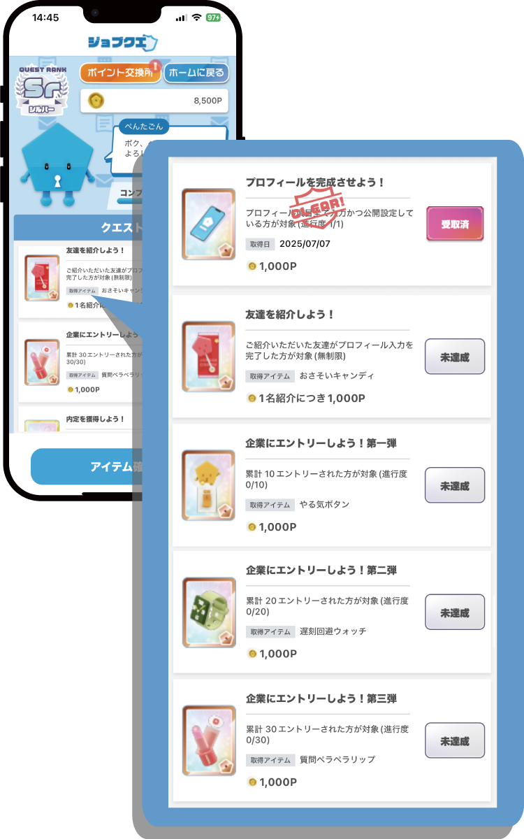 「自宅で企業を知らべる時間」や「就活系学習動画を見る時間」、「気になる企業の説明会に行く時間」など、クエスト化さた就職活動をクリアするたびにポイントが付与されます。