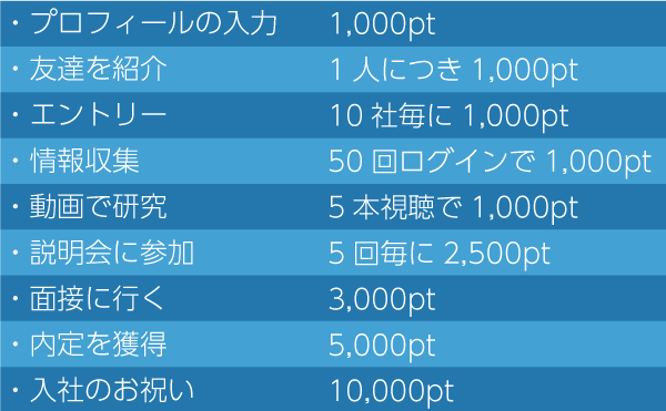 就活における行動の一つ一つにポイントが付与されます。
